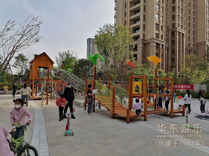 • 该项目采用非标定制木制工艺,有滑梯、沙池、传声筒 、爬网已经音乐系列的敲打设备,整体设计完美,符合房地产整体规划。