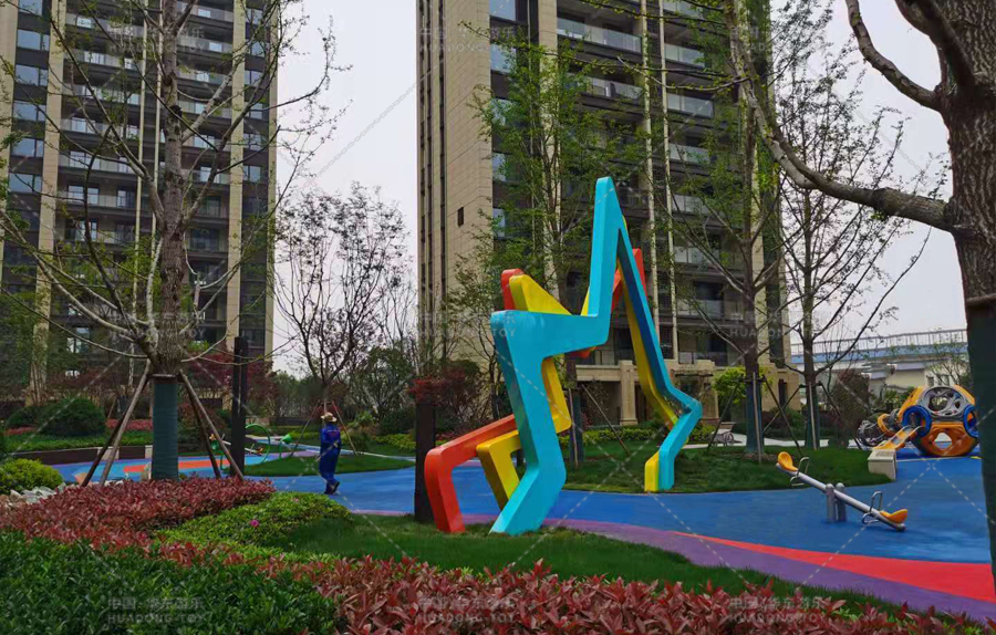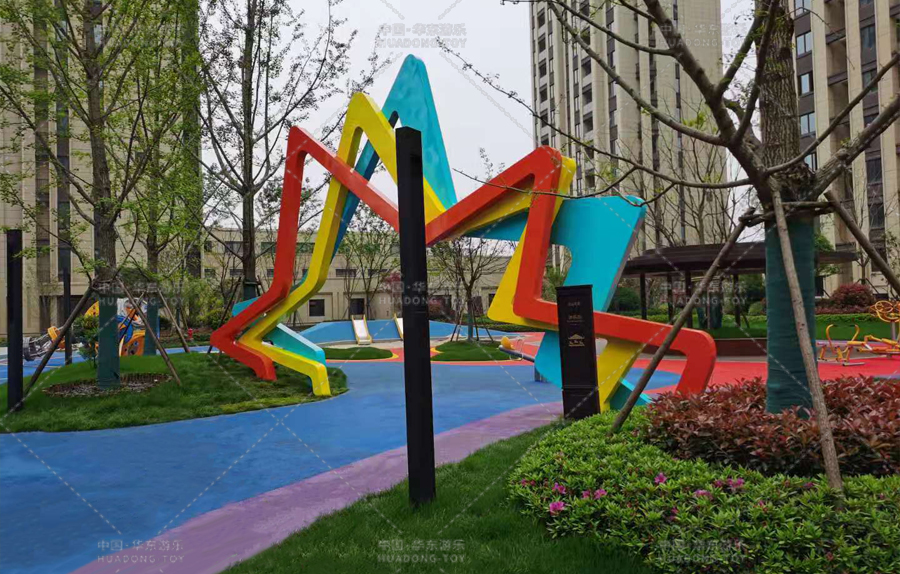 祥生云山新语项目采用的是以星星形状的门型为原型而设计的游乐场地,该场地放置了跷跷板、微地形,攀爬墙等游乐设备。