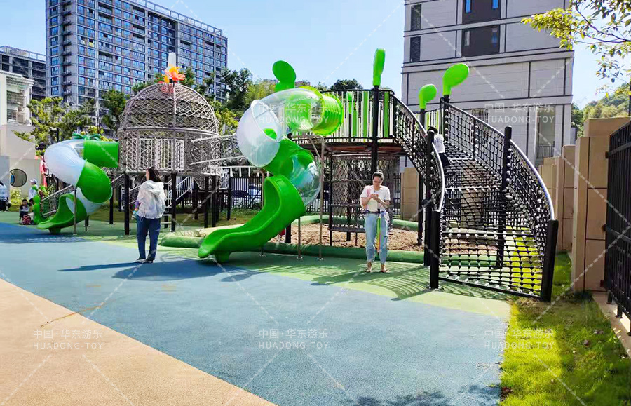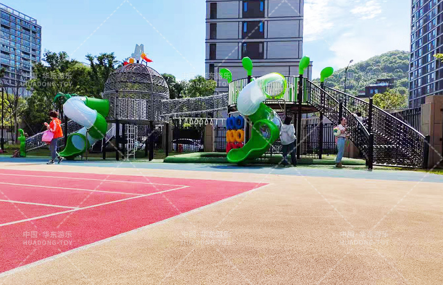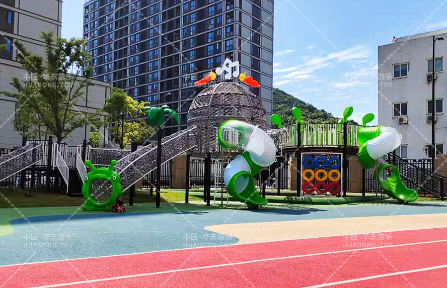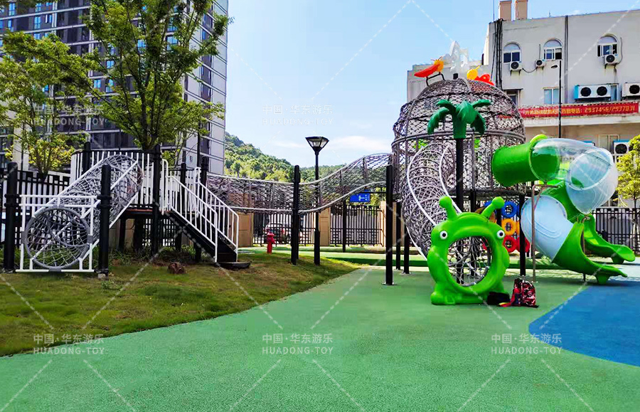 舟山市畚斗岙幼儿园此次选用的是又leyu.乐鱼游乐自主研发和设计的网绳系列户外滑梯组合,具备了爬网、钻洞、滑梯、滑桶、吊环、攀爬梯、沙池等游乐设备,能够让小朋友在玩耍中得到很好的锻炼和学习。