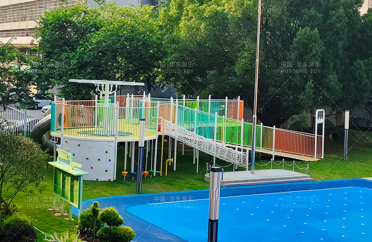 三明市实验幼儿园 选用的是leyu.乐鱼游乐自主研发和设计的非标定制系列的组合游乐设备,是一款具备了攀爬网、空中网桥、攀爬墙、儿童秋千、大型滑筒、平衡吊环、彩虹桥等功能,除此之外还设置了树形休闲厅、木制小桥等游乐设备,让孩子们有一个健康的成长环境,也为老师的教学提供了保障。